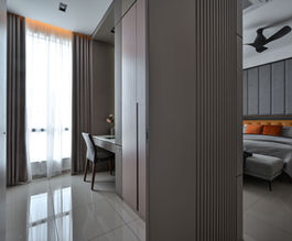 The boy's room exhibits a gray neutral style, with contrasting shades utilized for the desk, wall, and cabinets, adding depth to the overall space. The girl's room features a wine-red color scheme at the head of the bed, complemented by elegant woodgrain elements.