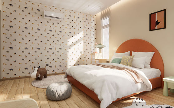 The boy's room exhibits a gray neutral style, with contrasting shades utilized for the desk, wall, and cabinets, adding depth to the overall space. The girl's room features a wine-red color scheme at the head of the bed, complemented by elegant woodgrain elements.