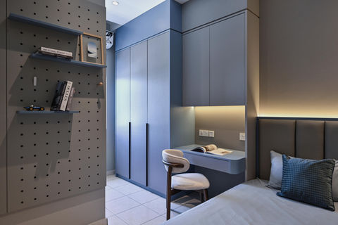 The boy's room exhibits a gray neutral style, with contrasting shades utilized for the desk, wall, and cabinets, adding depth to the overall space. The girl's room features a wine-red color scheme at the head of the bed, complemented by elegant woodgrain elements.